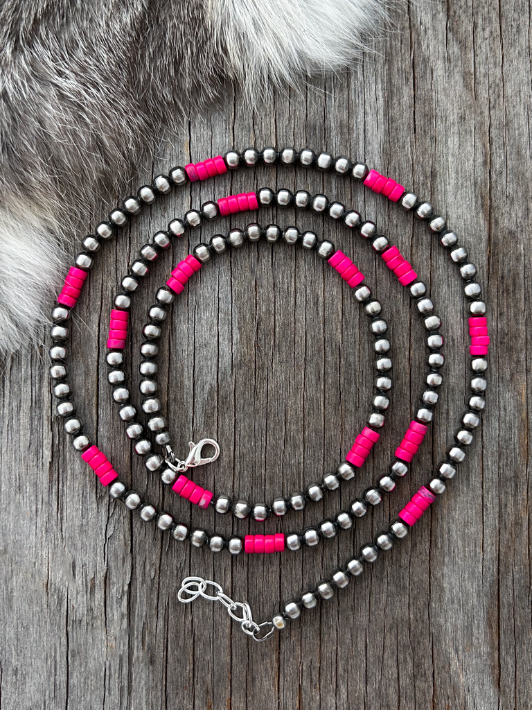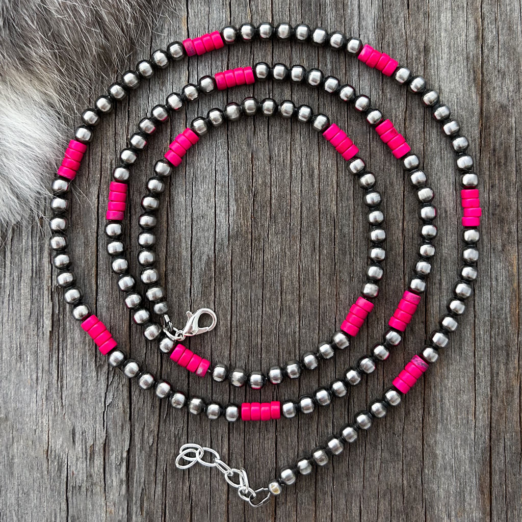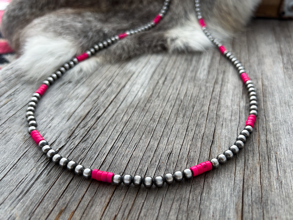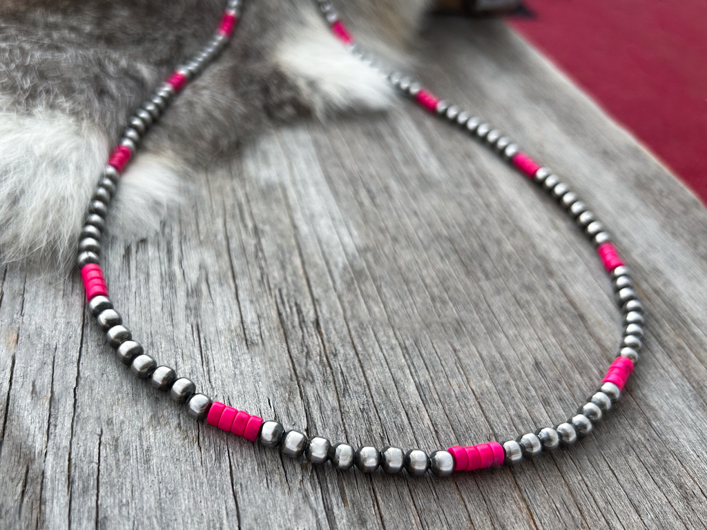 Pretty & Petite all 5mm Handmade Navajo Pearls necklace. Accented with petite pink turquoise heishi beads :-) Navajo Pearls are 5mm, Turquoise beads are 5mm.
