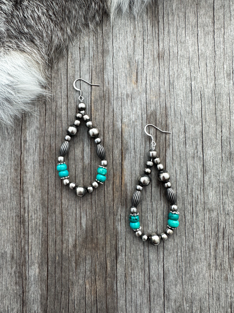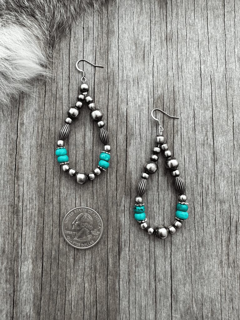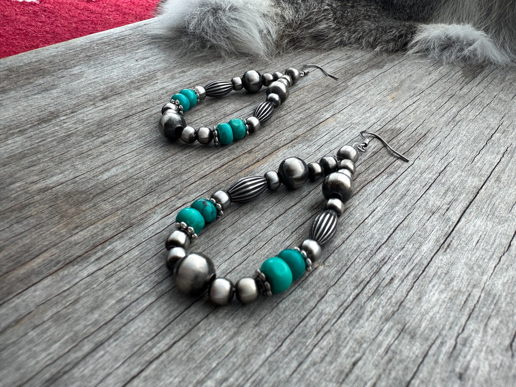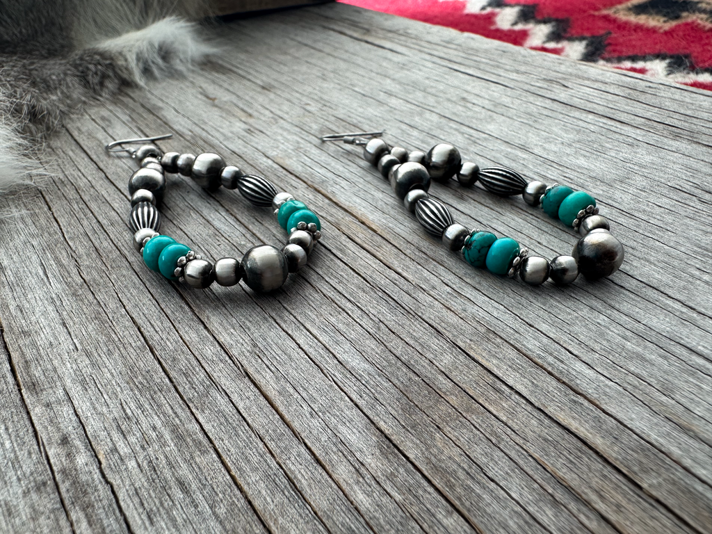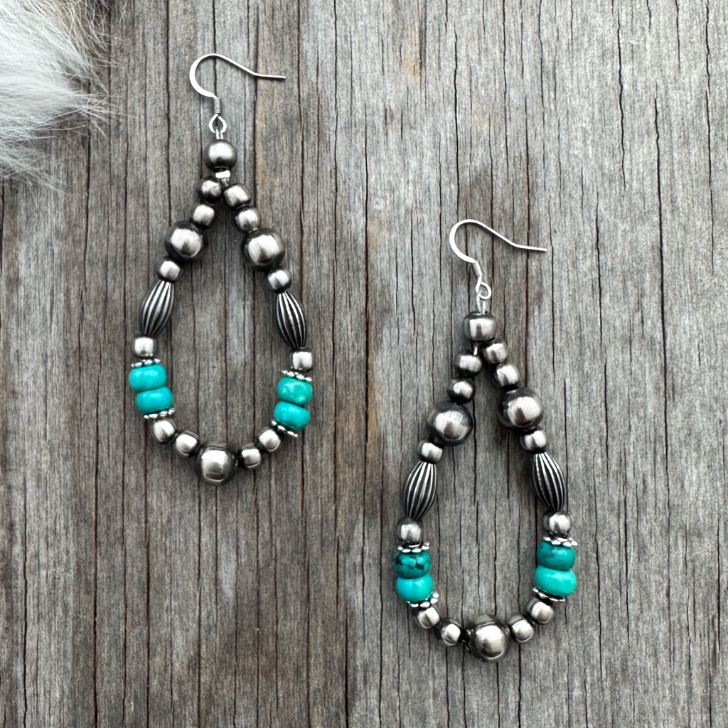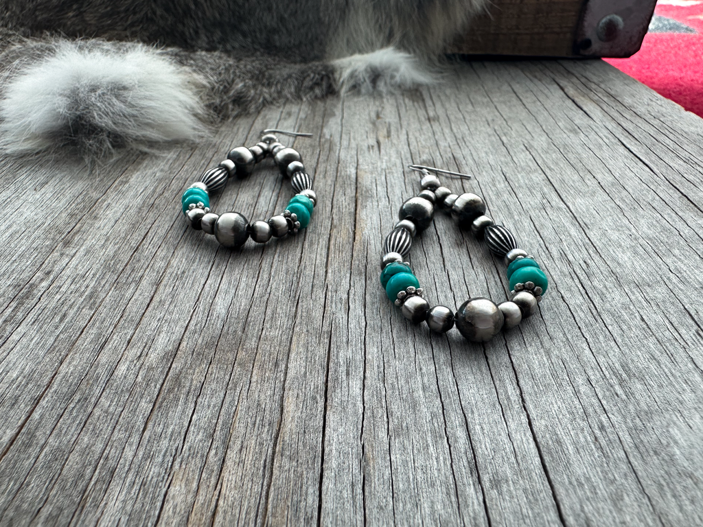 Navajo Pearl Handmade Stylish Teardrop Earrings with Blue Turquoise & Pumpkin Beads ~ German Silver beads!