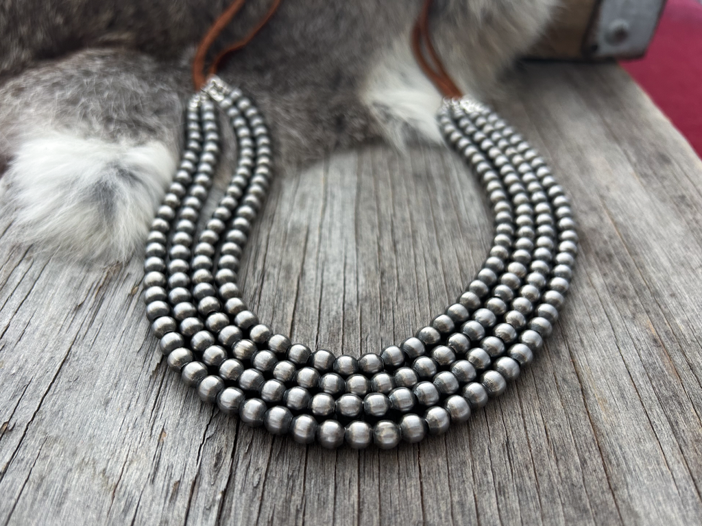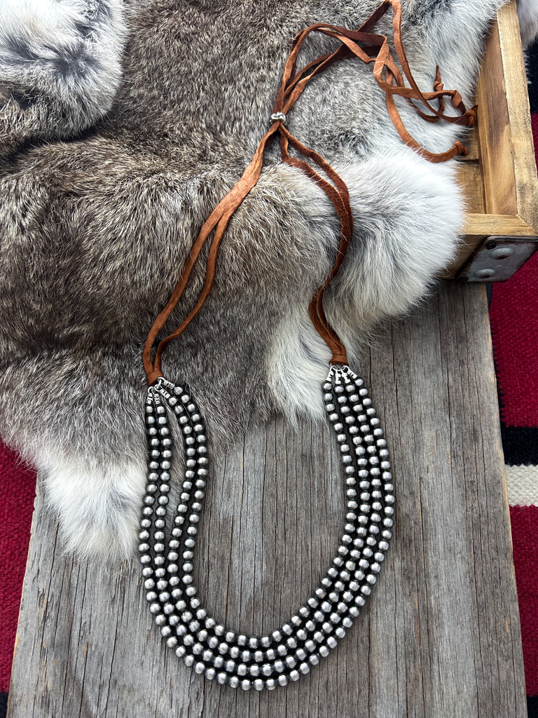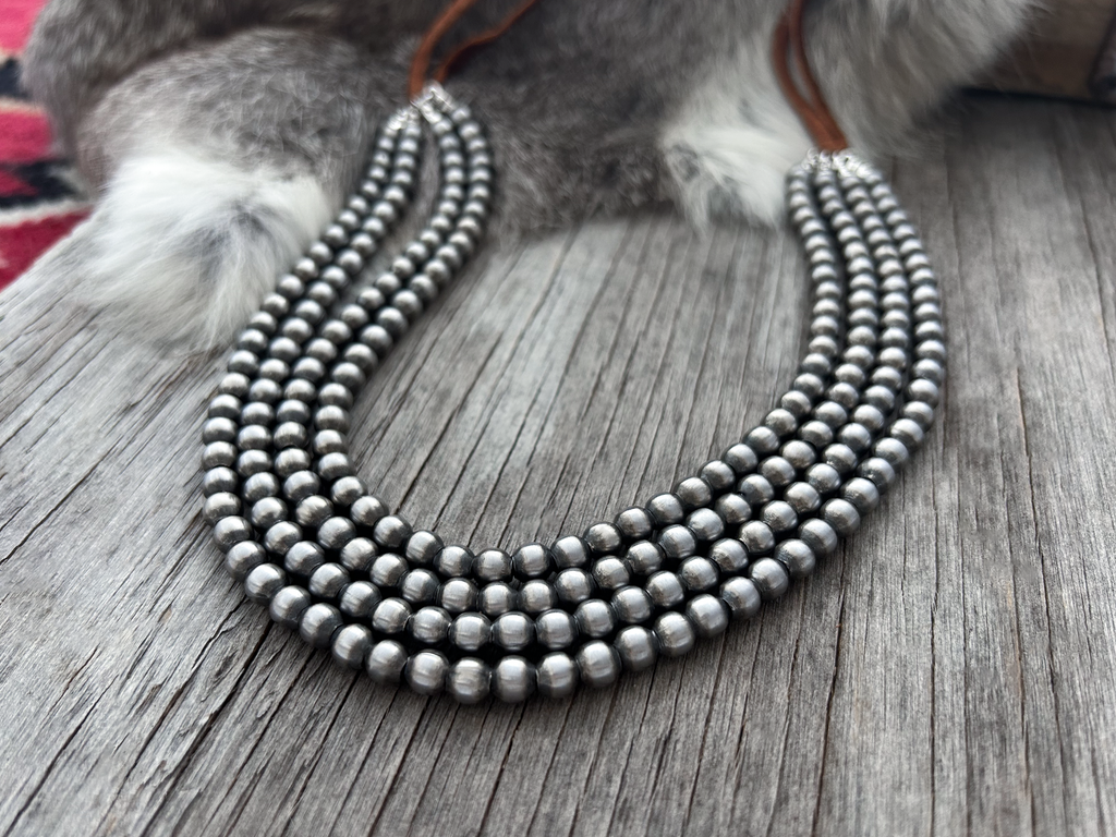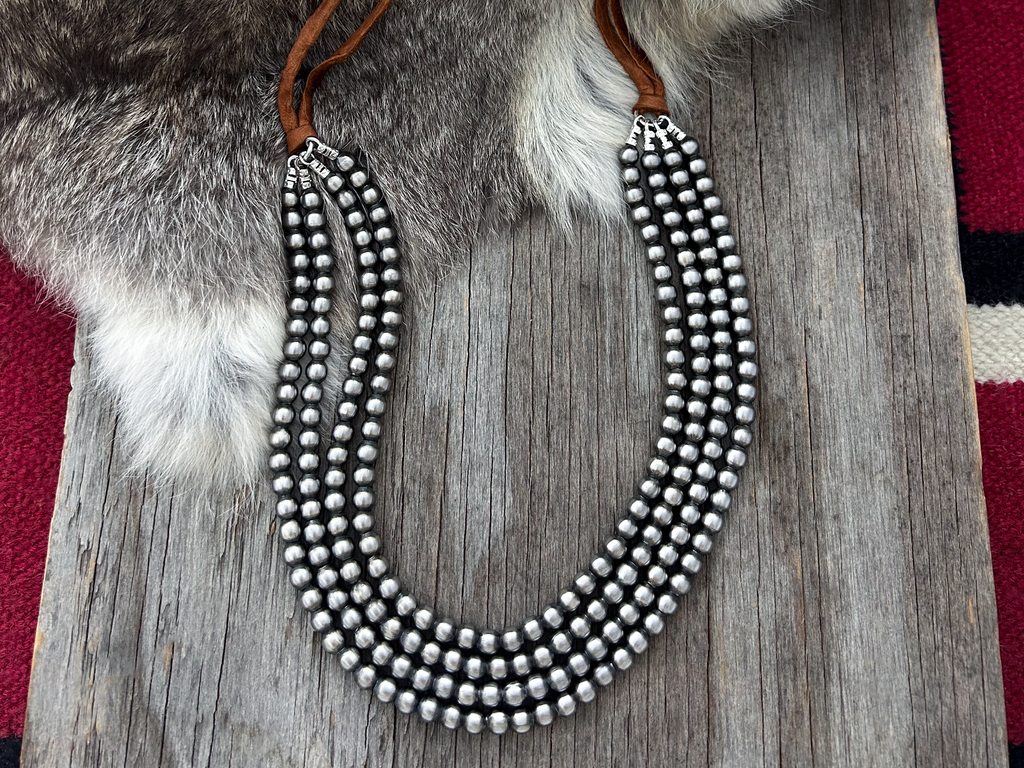 Navajo Pearl Handmade Four Strand Leather Necklace with all 6mm German Silver beads ~ Adjustable!