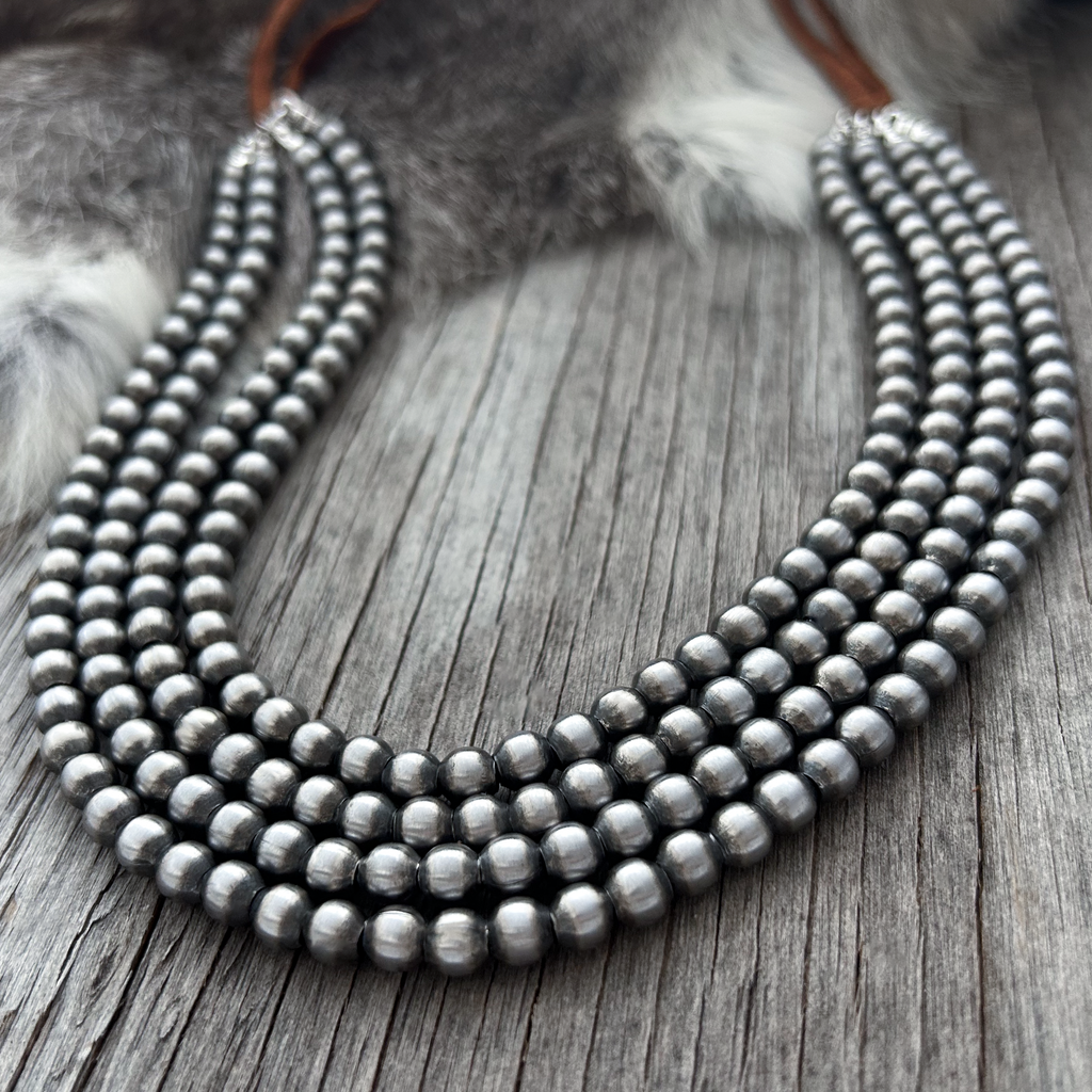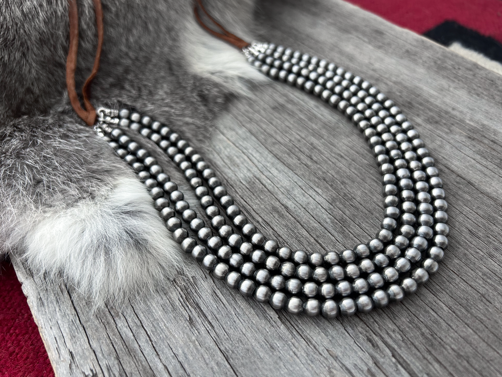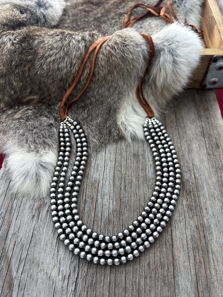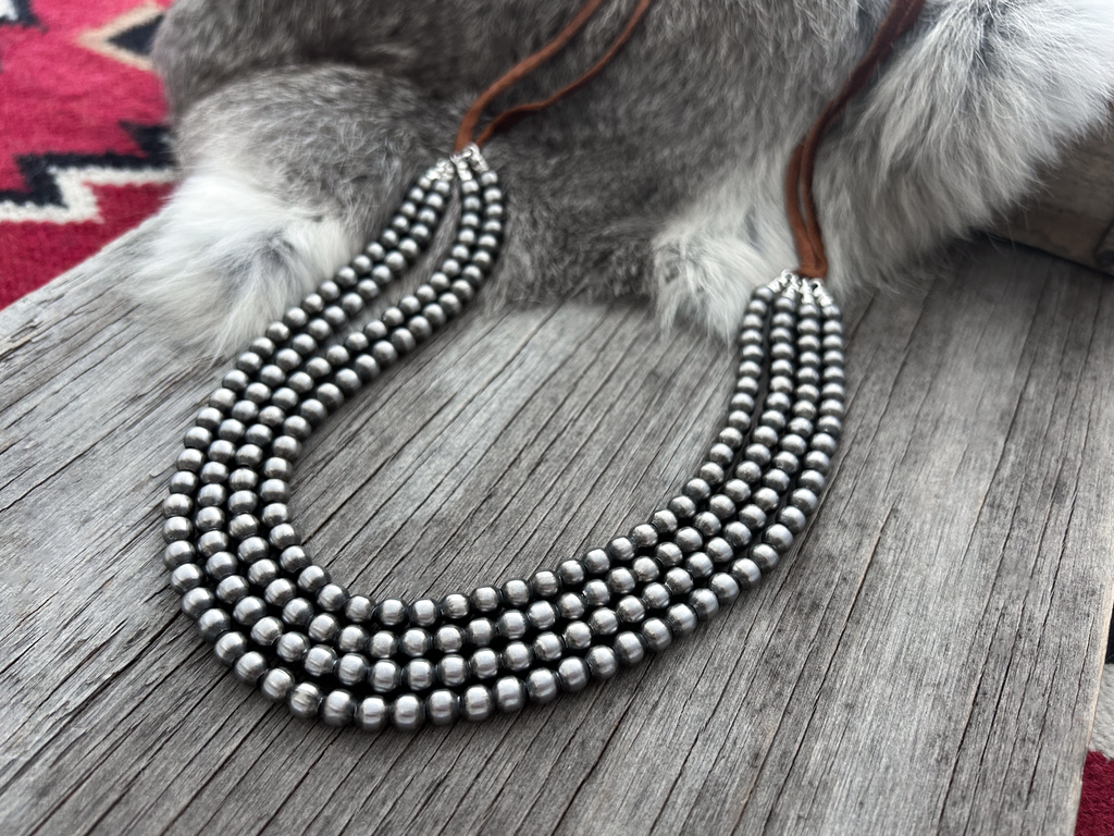 Navajo Pearl Handmade Four Strand Leather Necklace with all 6mm German Silver beads ~ Adjustable!