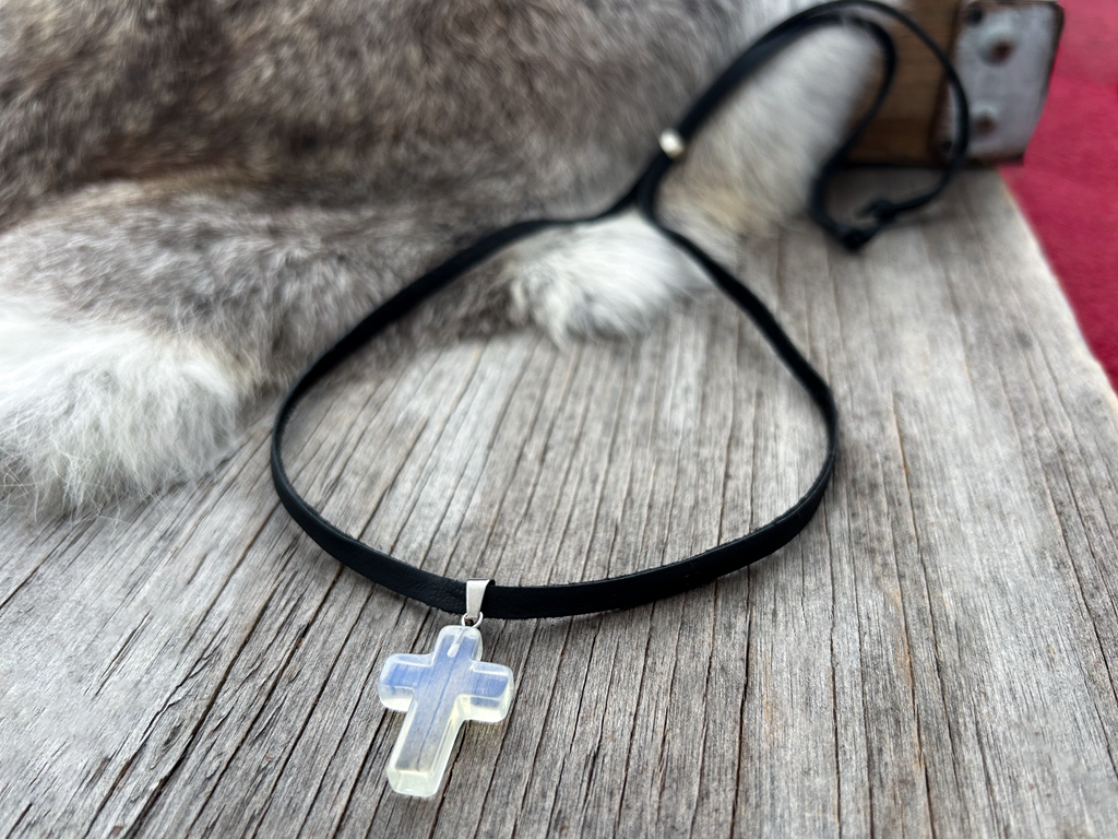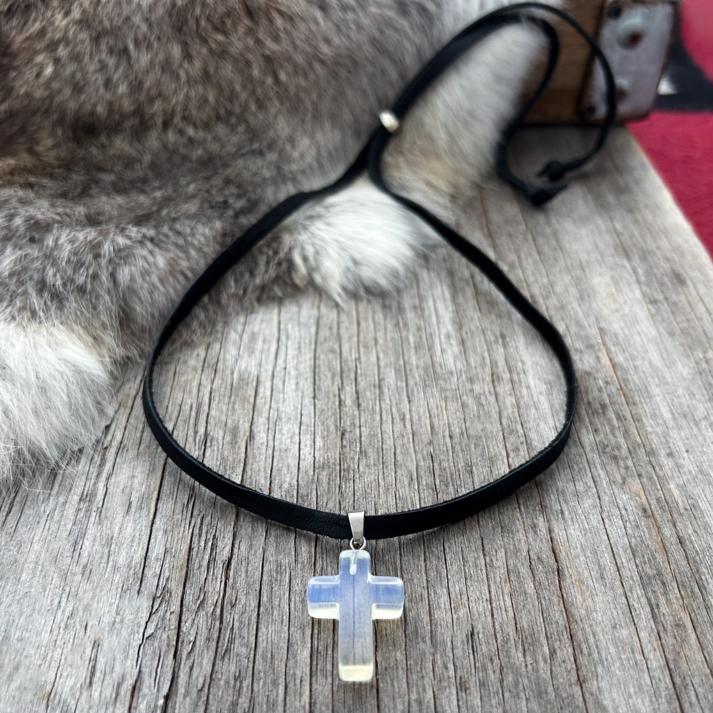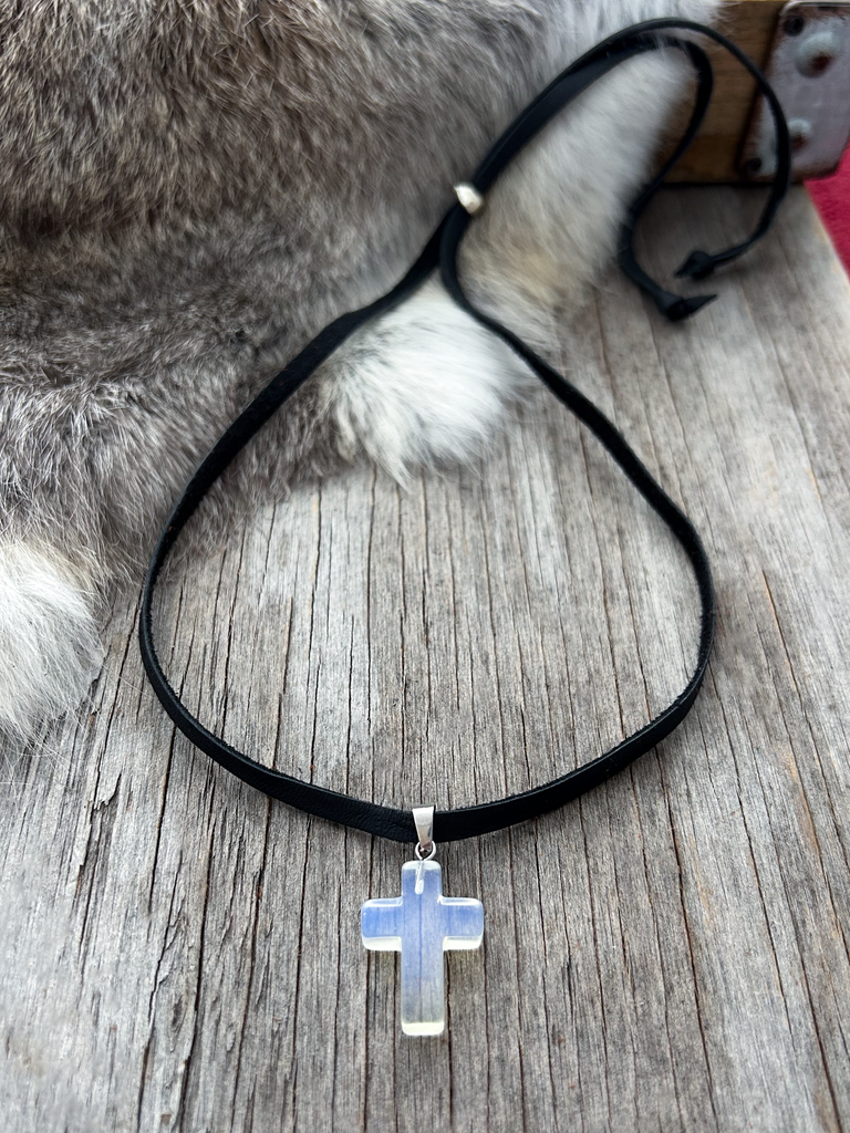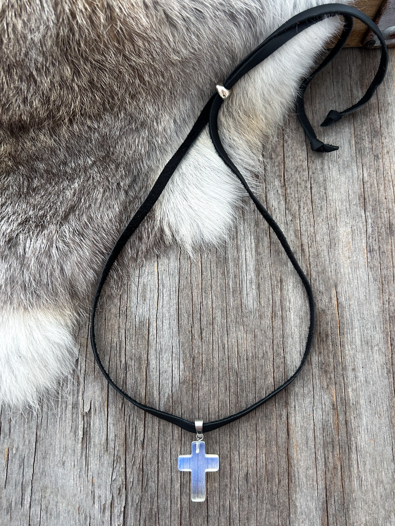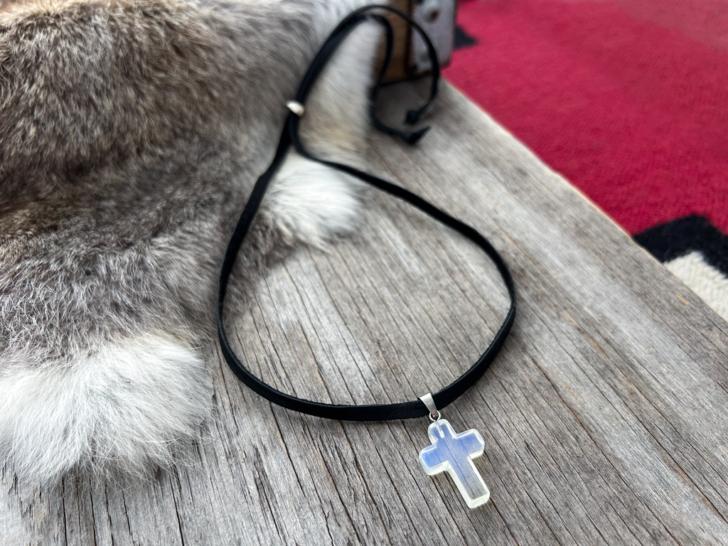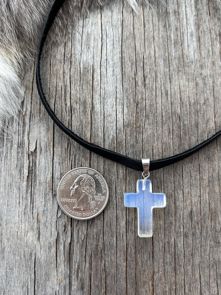 Opal Cross Pendant On Soft Black Leather ~ Slider Style & Adjustable!